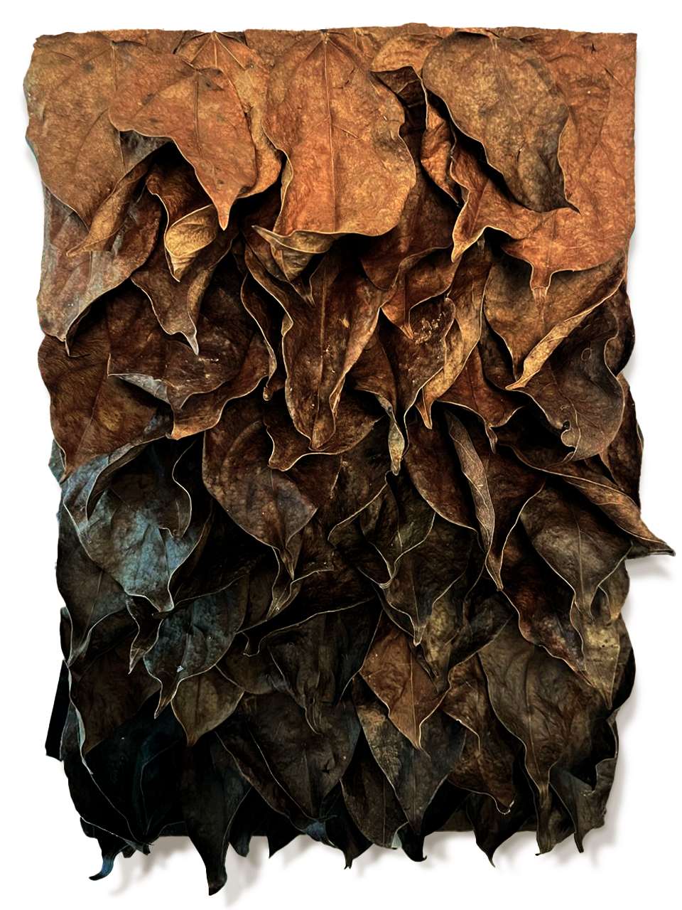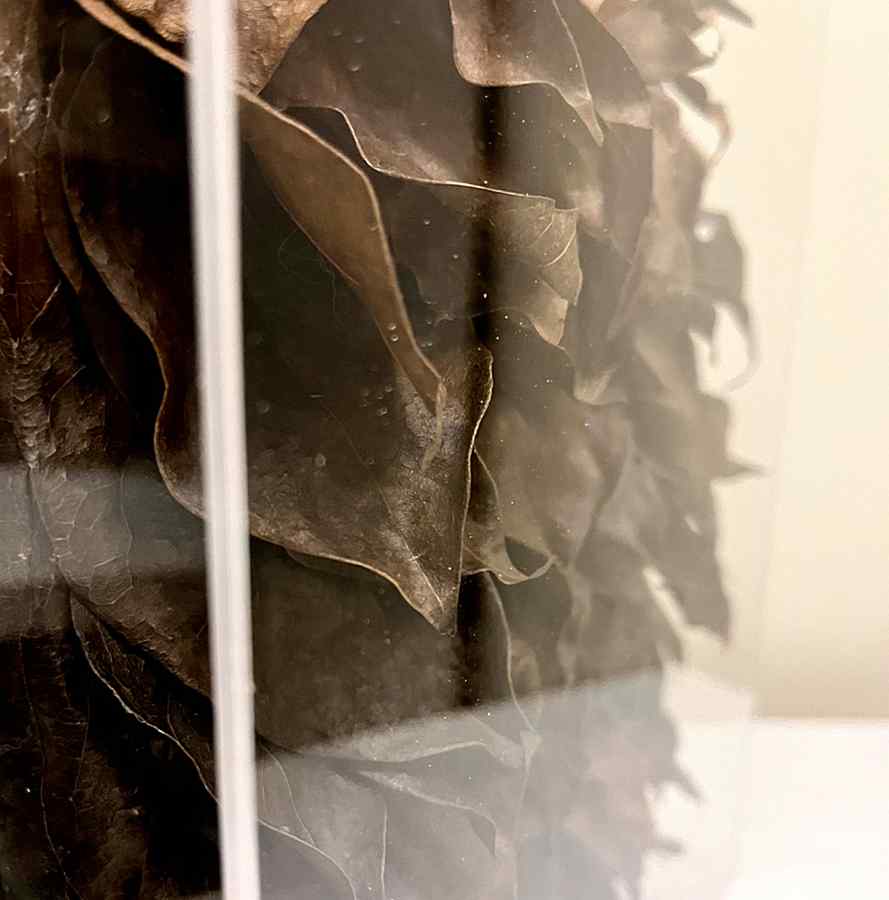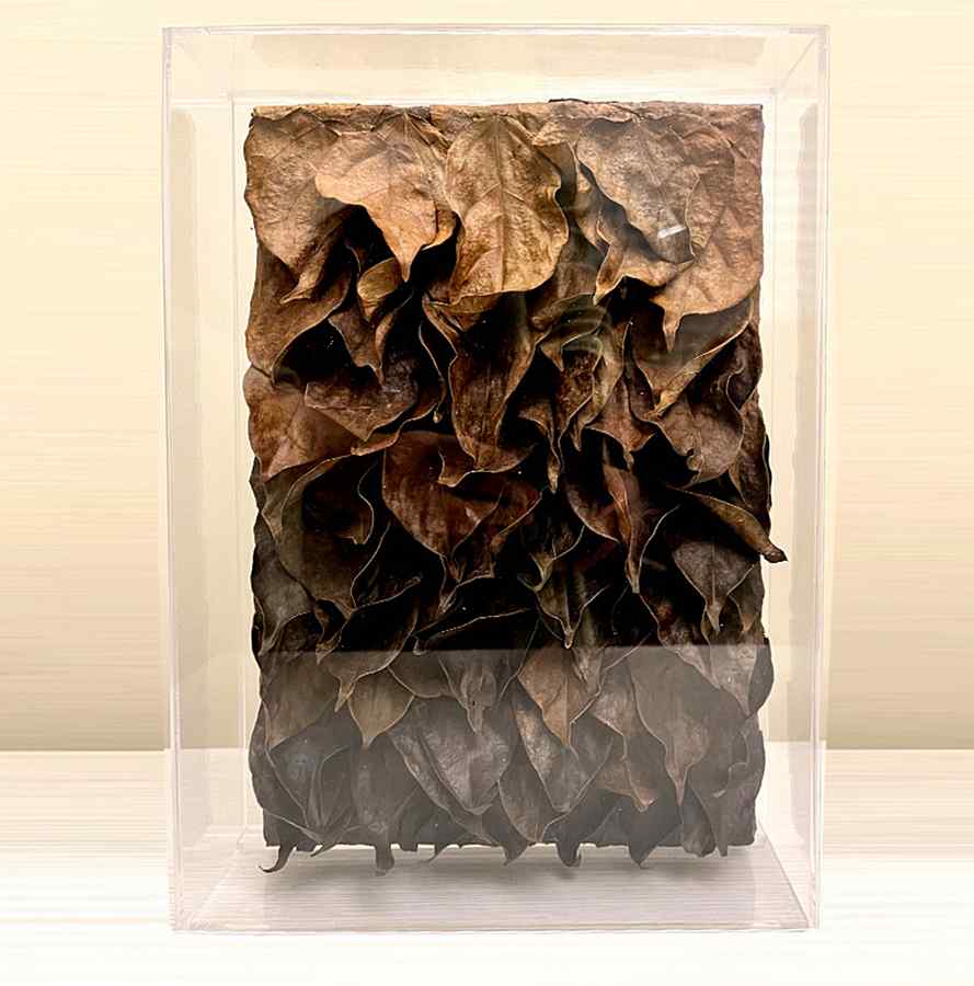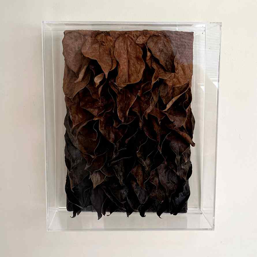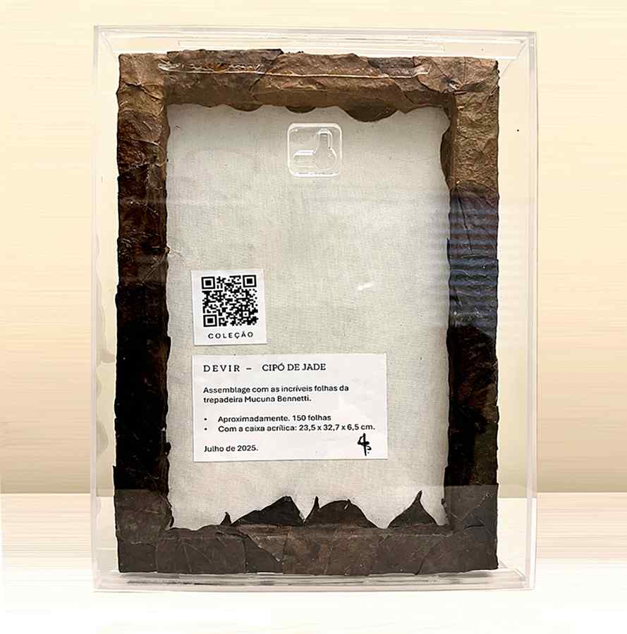Na série Devir, as folhas recolhidas após o ciclo natural de renovação são preservadas e aplicadas em composições de relevo, eternizando a energia vibrante e o movimento característico dessa trepadeira única.
