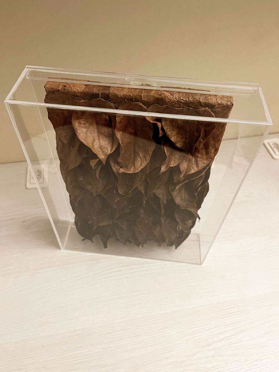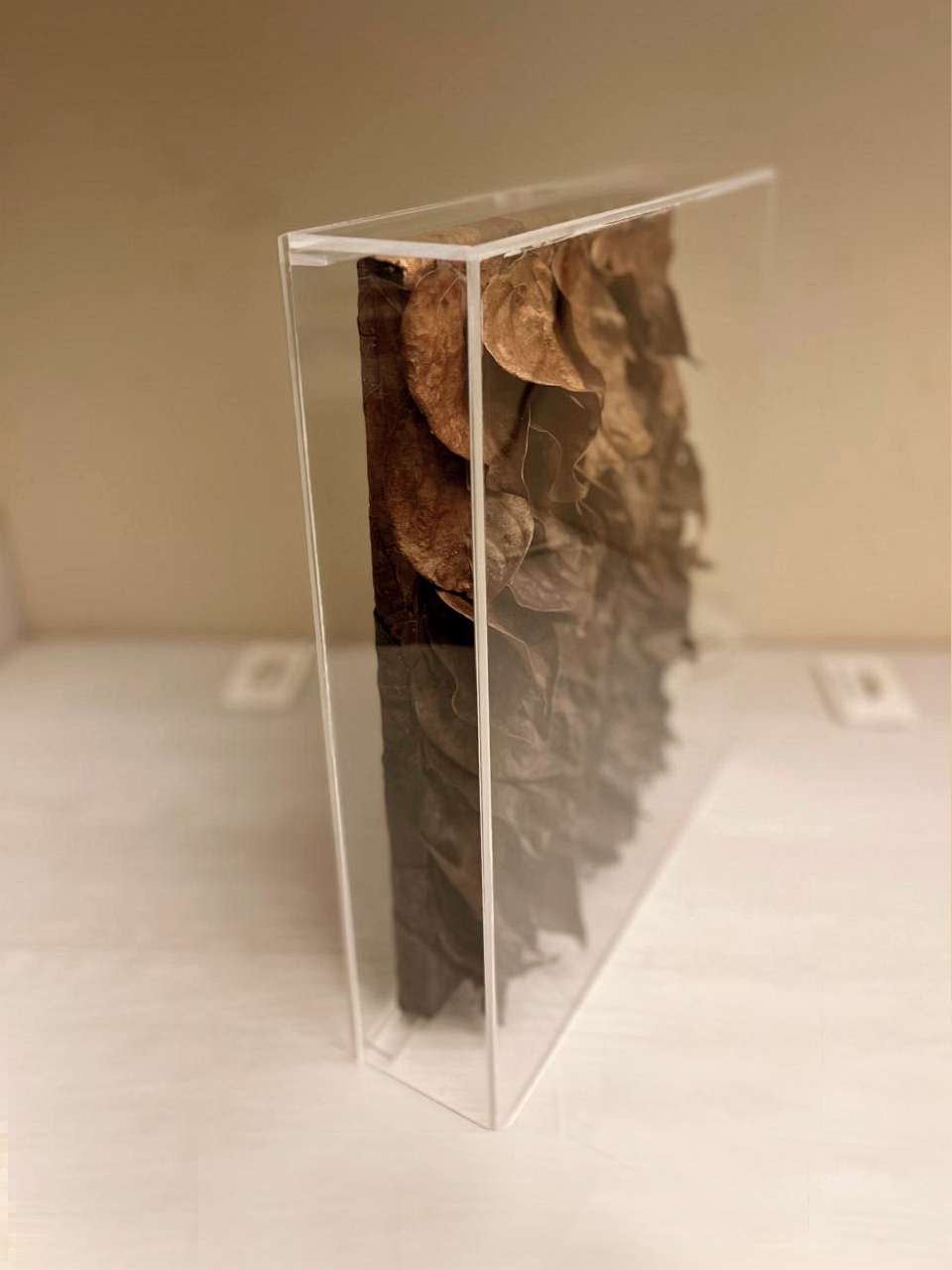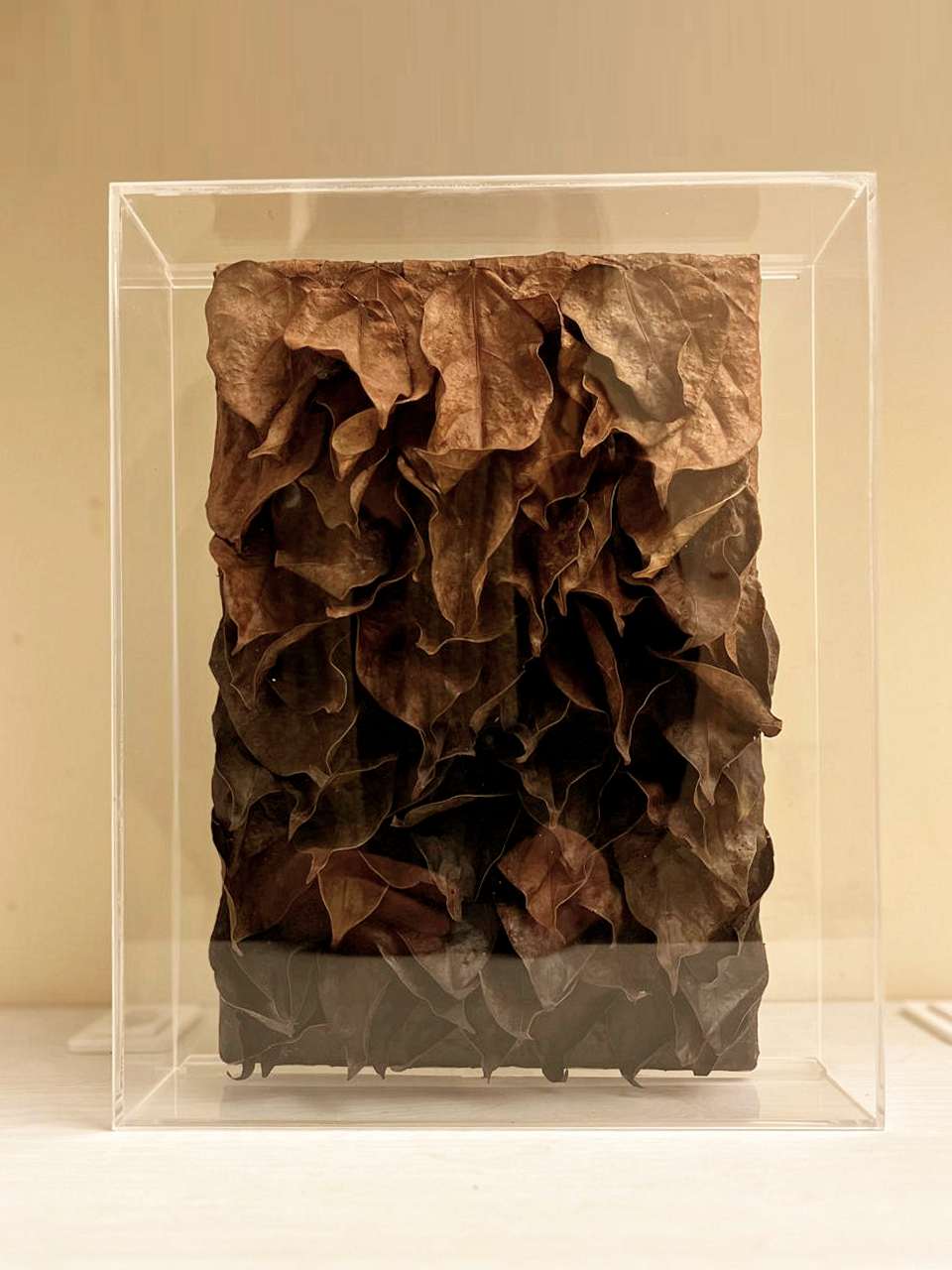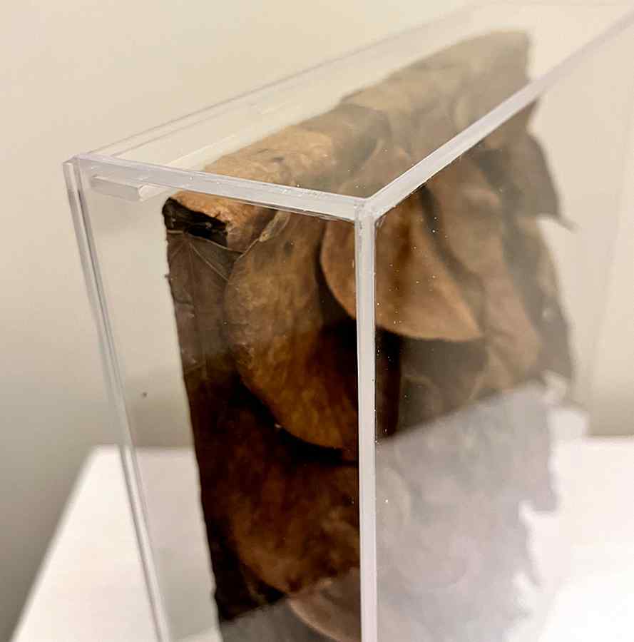 Na série Devir, as folhas recolhidas após o ciclo natural de renovação são preservadas e aplicadas em composições de relevo, eternizando a energia vibrante e o movimento característico dessa trepadeira única.