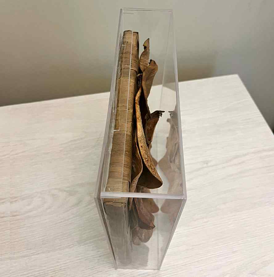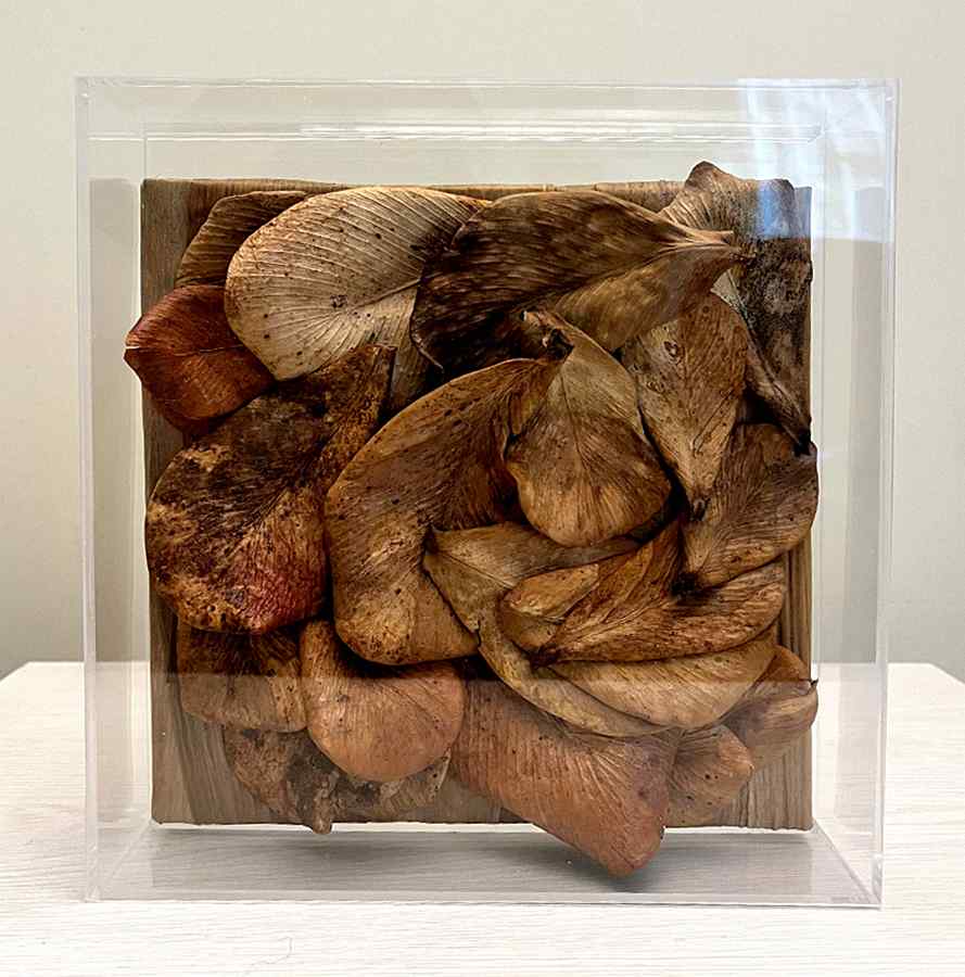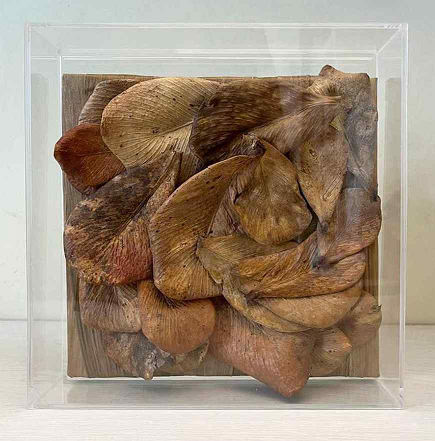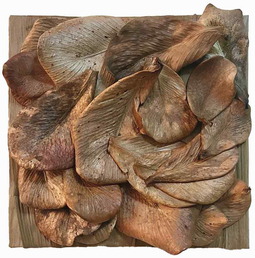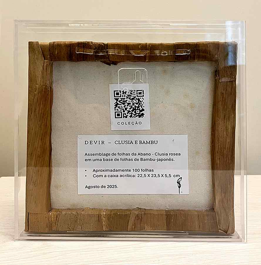 Quando desidratadas estas belas e coloridas folhas assumem um estado de maior rigidez, e por isso elegemos nosso “papiro” predileto que são as folhas do bambu japonês, extremamente resistentes e maleáveis, para forrar o quadro que irá receber essas encantadoras folhas.