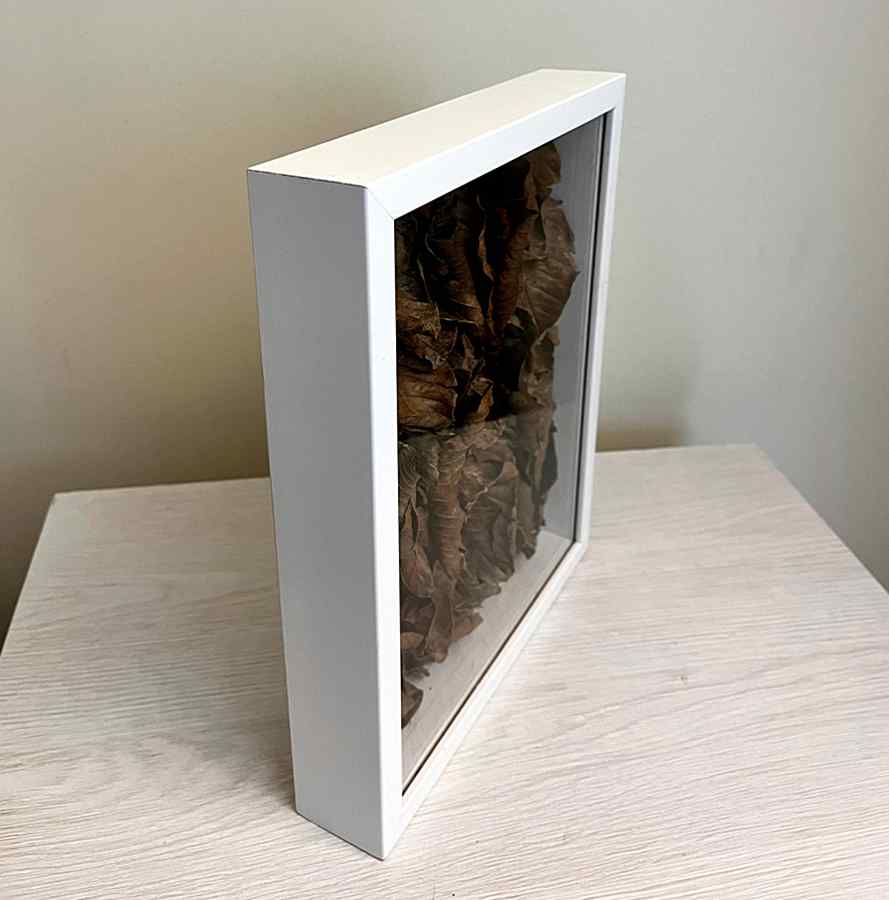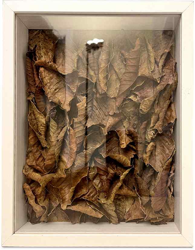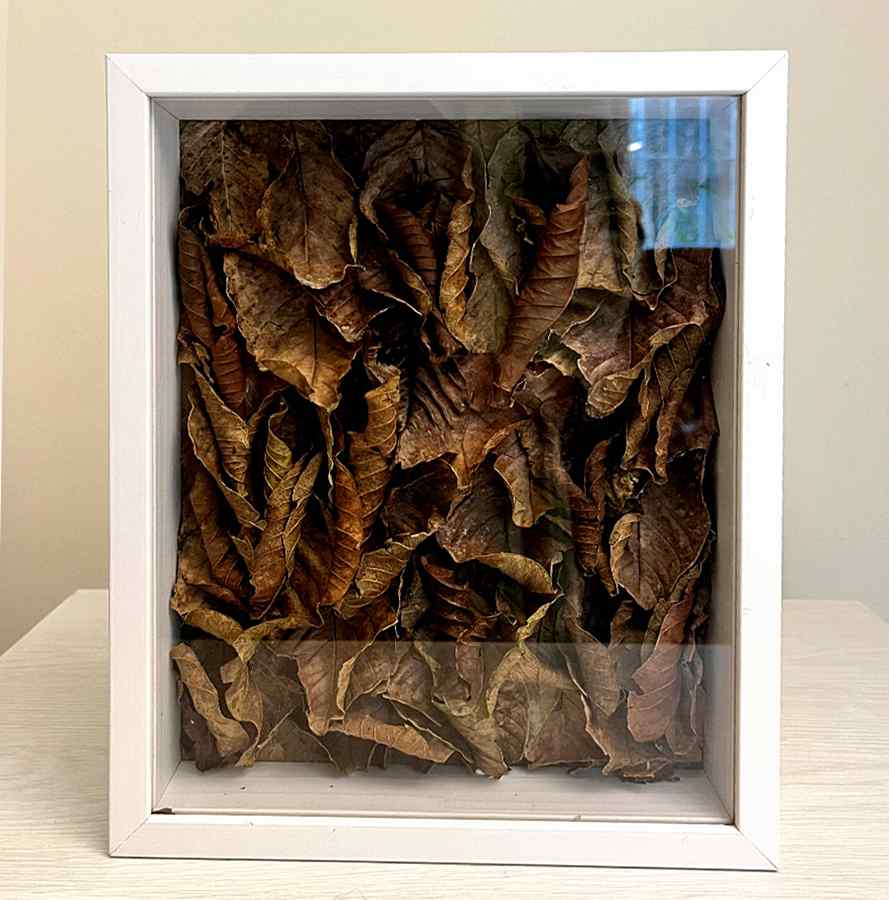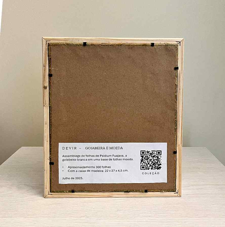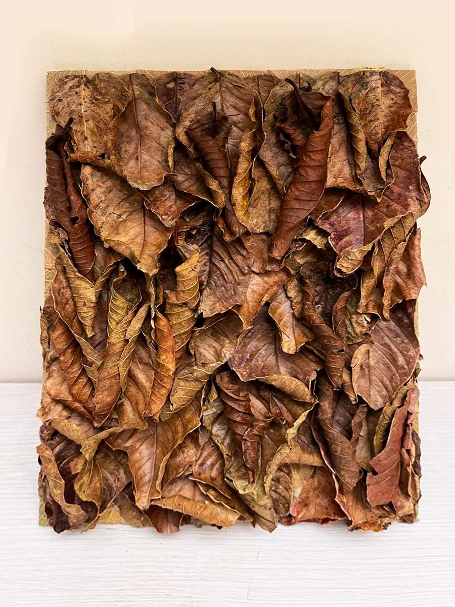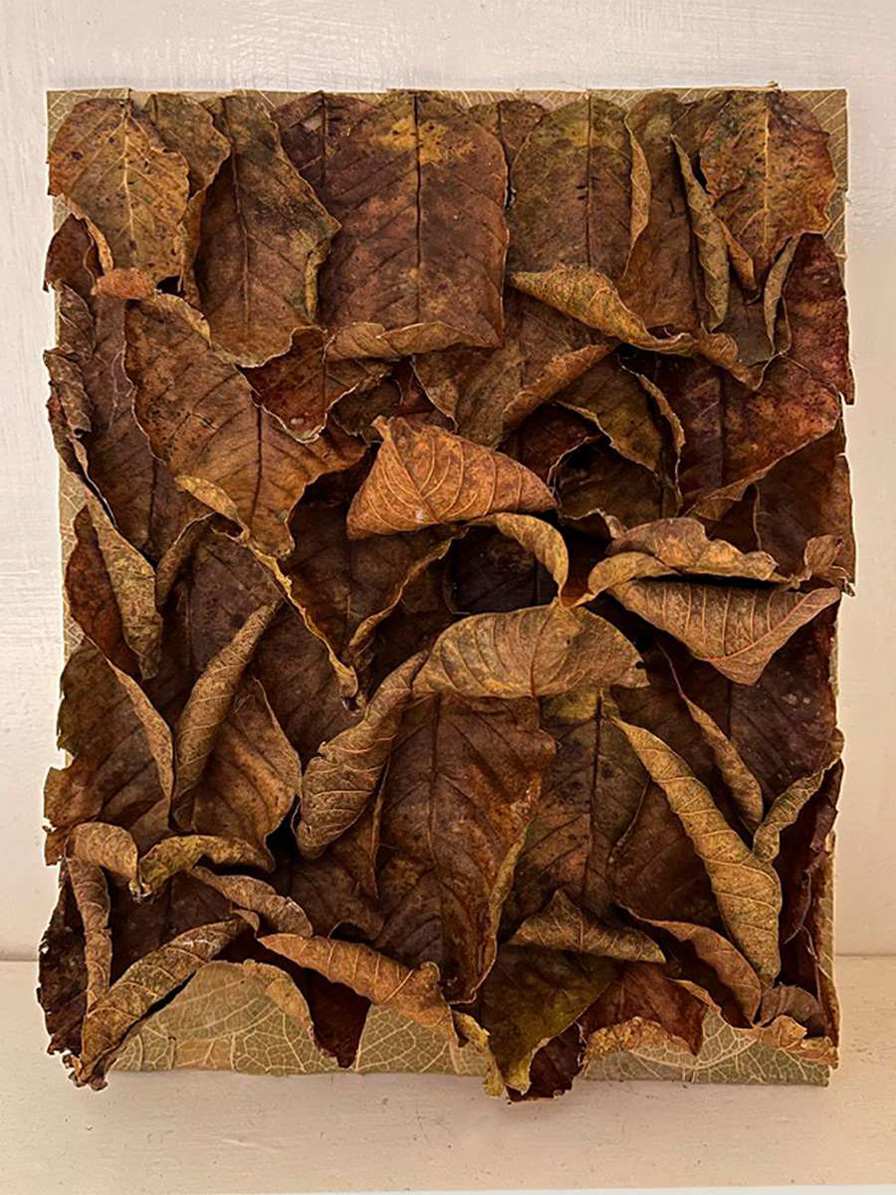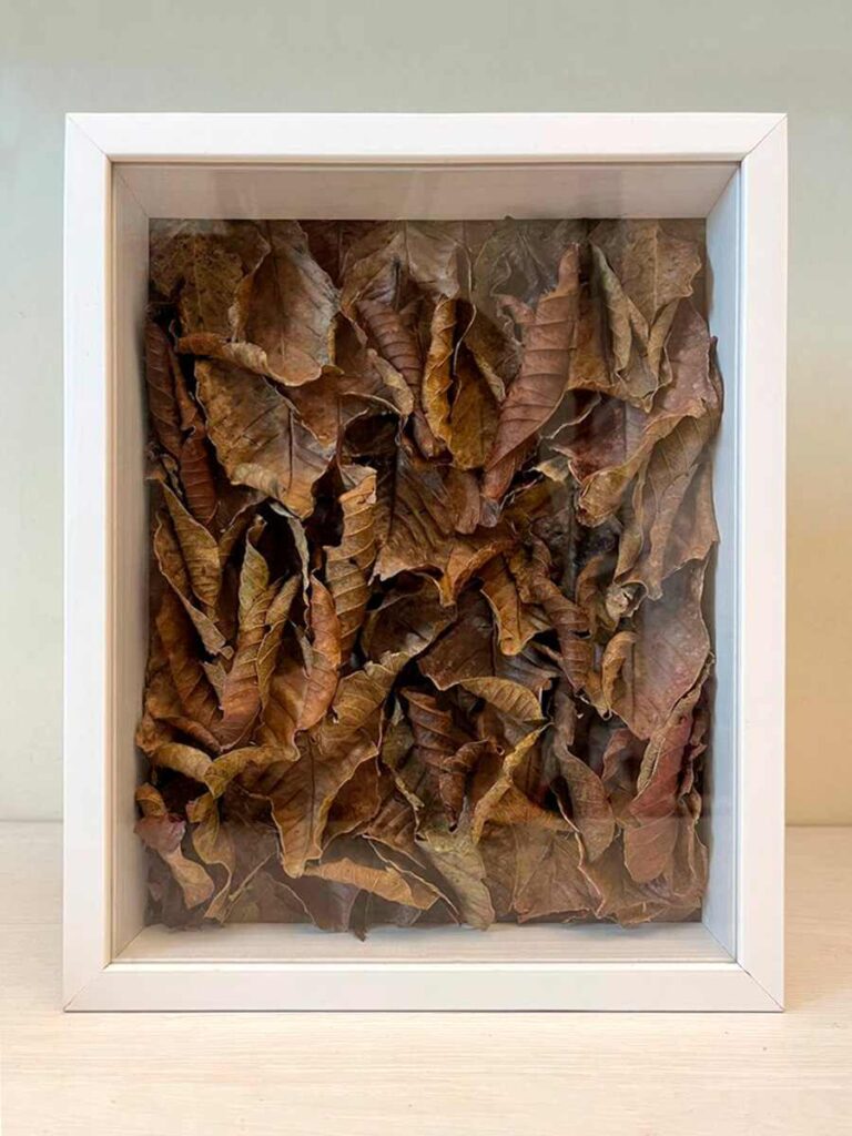 As folhas de goiabeira têm personalidade, são voluntariosas quando desidratadas. Estamos estudando esses processos para encontrar diversos resultados de escultura natural na nossa coleção de quadros.
