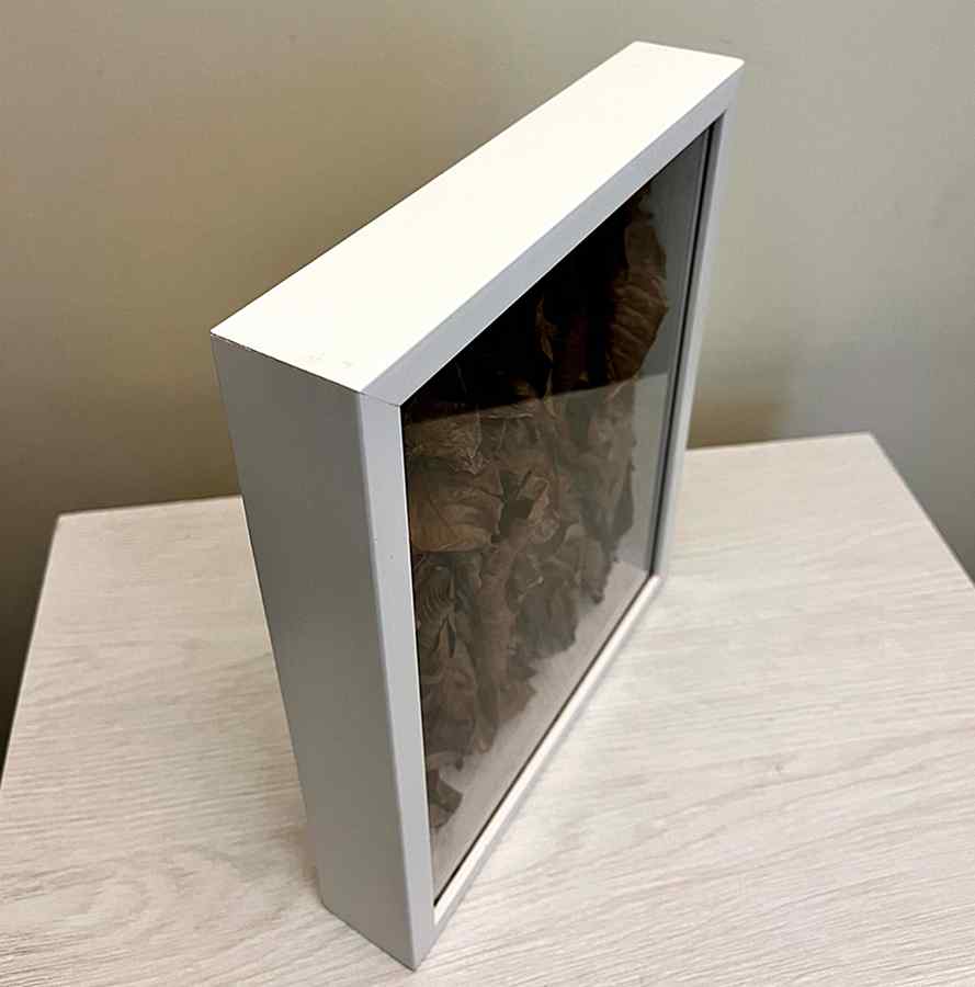 O resultado é uma composição em que a força e a doçura da goiabeira-branca dialogam com a suavidade das folhas de Chamaecrista, (a folha moeda) que usamos para revestir o quadro.