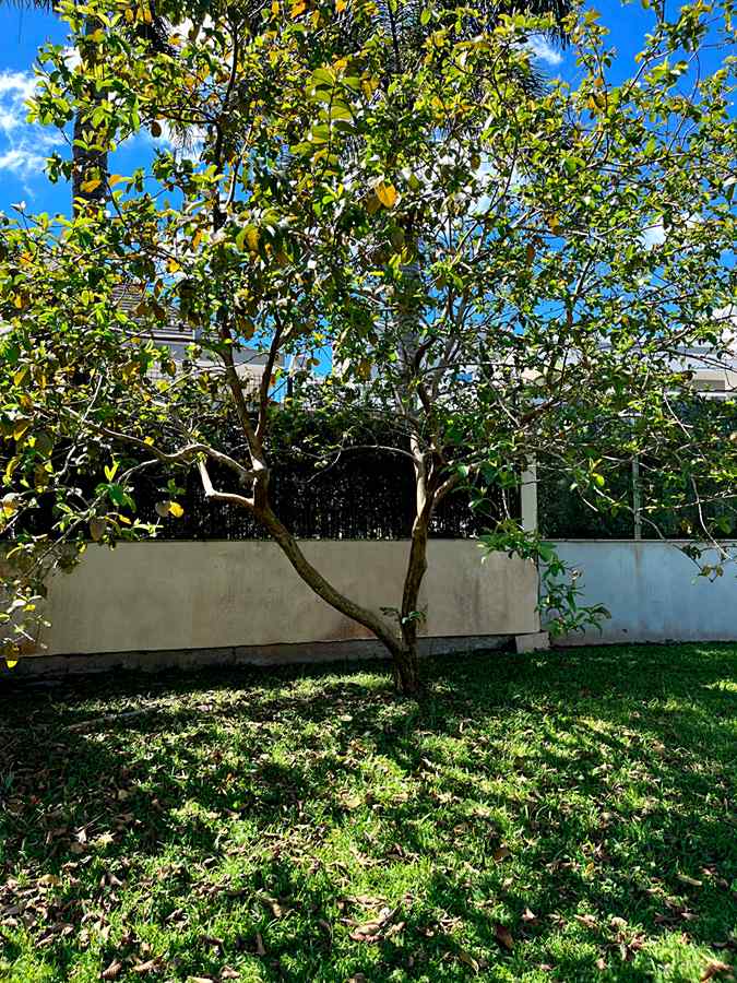A Goiabeira-branca (Psidium guajava), popularmente conhecida simplesmente como goiabeira, é uma árvore frutífera de origem tropical, pertencente à família Myrtaceae. Nativa das Américas, encontrou nas terras brasileiras um de seus habitats mais favoráveis, tornando-se presença constante em quintais, pomares e paisagens rurais e diversas no parque que frequento.